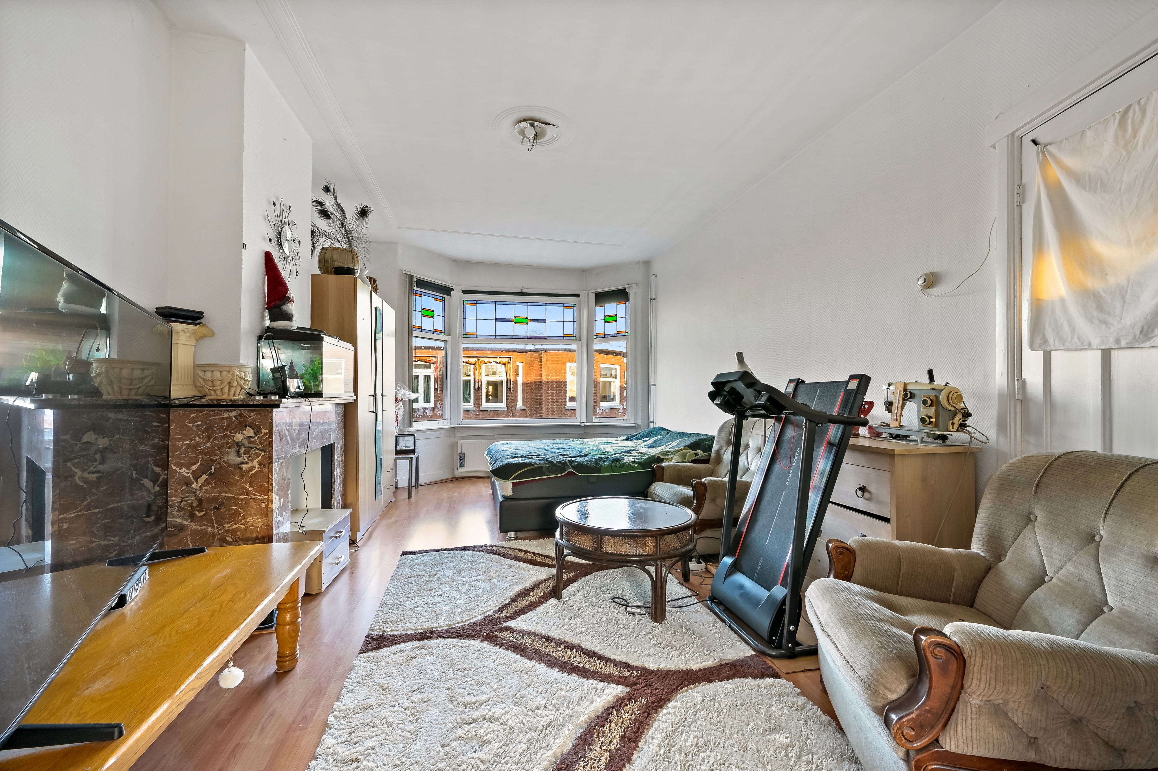 -Voorzijde woning houten kozijnen met enkel glas en glas-in-lood.