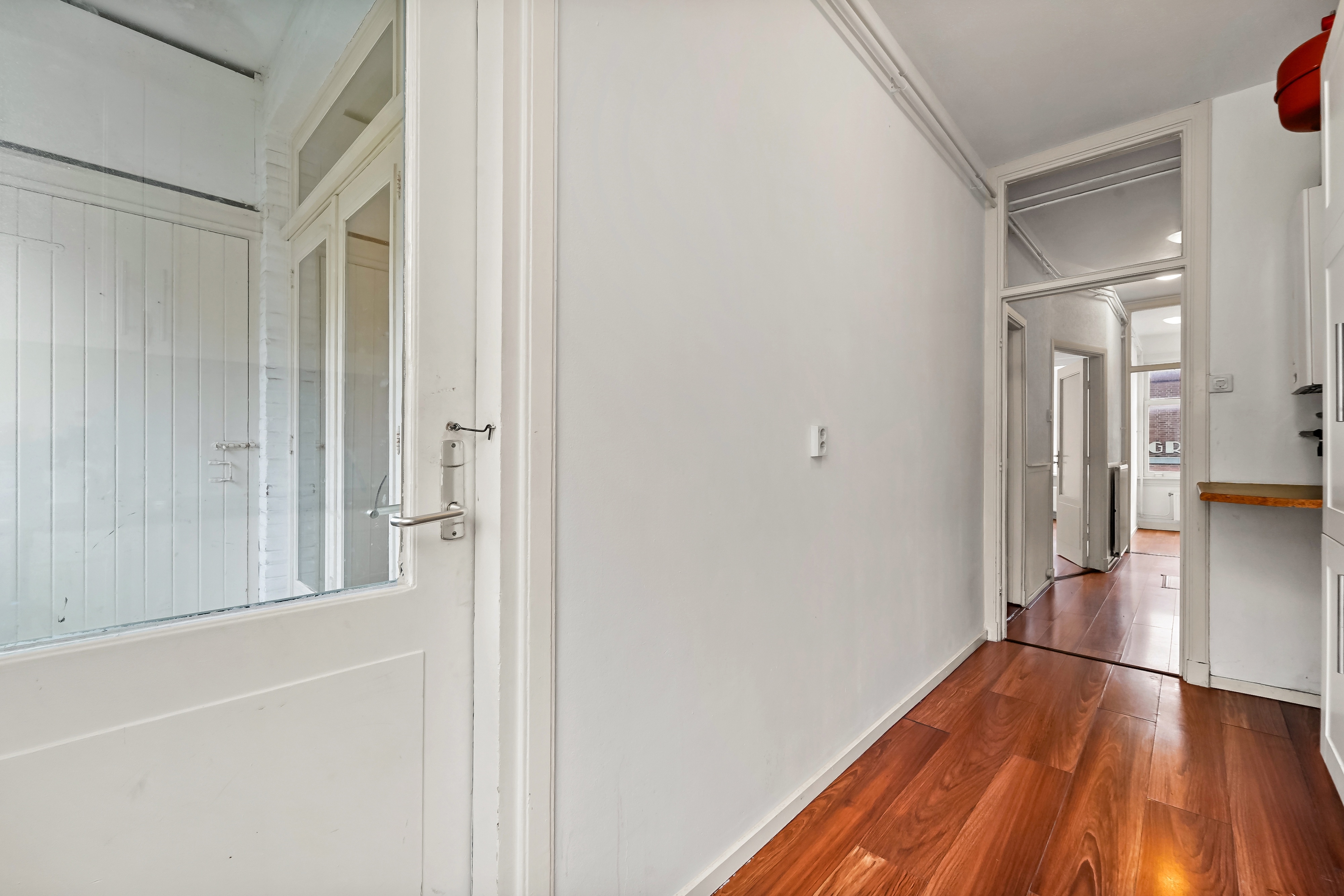 Entree woning op de eerste verdieping; U-vormige gang waar alle vertrekken op uit komen met vaste kast (meterkast) en kast met fontein; woonkamer (5.73 x 3.26) met erker; slaapkamer I (2.45 x 2.34) aan de voorzijde; slaapkamer II (3.87 x 2.96) met vaste kast aan de achterzijde met openslaande deuren naar balkon; slaapkamer III (3.93/2.90 x 2.00) met dubbel glas; keuken aan de achterzijde (3.93 x 1.77) welke voorzien is van een 4-pits gas kookplaat, een afzuiger, combi oven, een koel vries combinatie, wasmachine aansluiting met toegang tot balkon; toilet met douche (1.92 x 0.93).