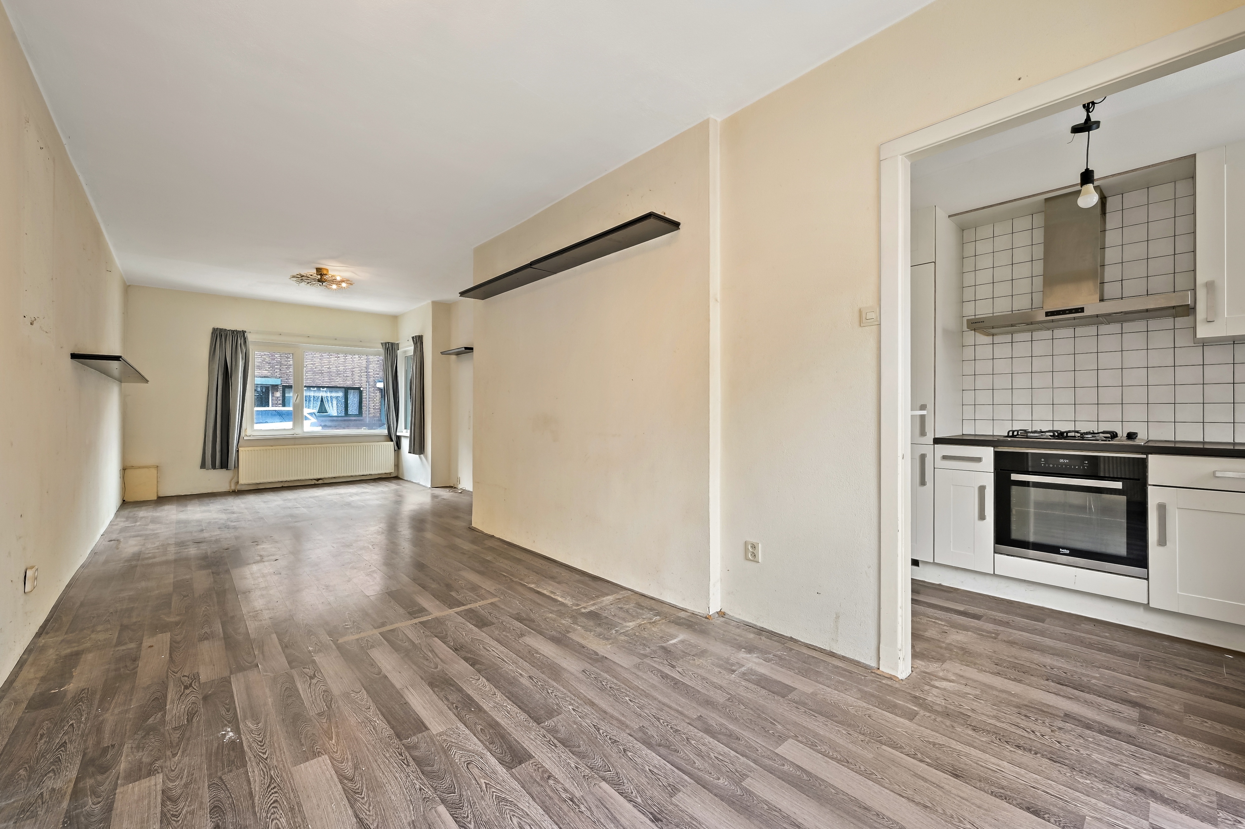 Entree woning middels voortuin (5.00 x 4.00/2.50). Voordeur met hal (1.10 x 0.96). Gang (3.91 x 1.75/0.96) met meterkast, separaat toilet en trap naar de eerste verdieping. Doorgebroken woon/eetkamer (9.12 x 3.49/2.63) met halfopen keuken (3.26 x 1.75) aan de achterzijde, welke voorzien is van een 4-pits gaskookplaat, combi-oven, afzuiger, een vaatwasser, koel-vries combinatie en toegang tot de achtertuin (6.25/5.00 x 5.00).