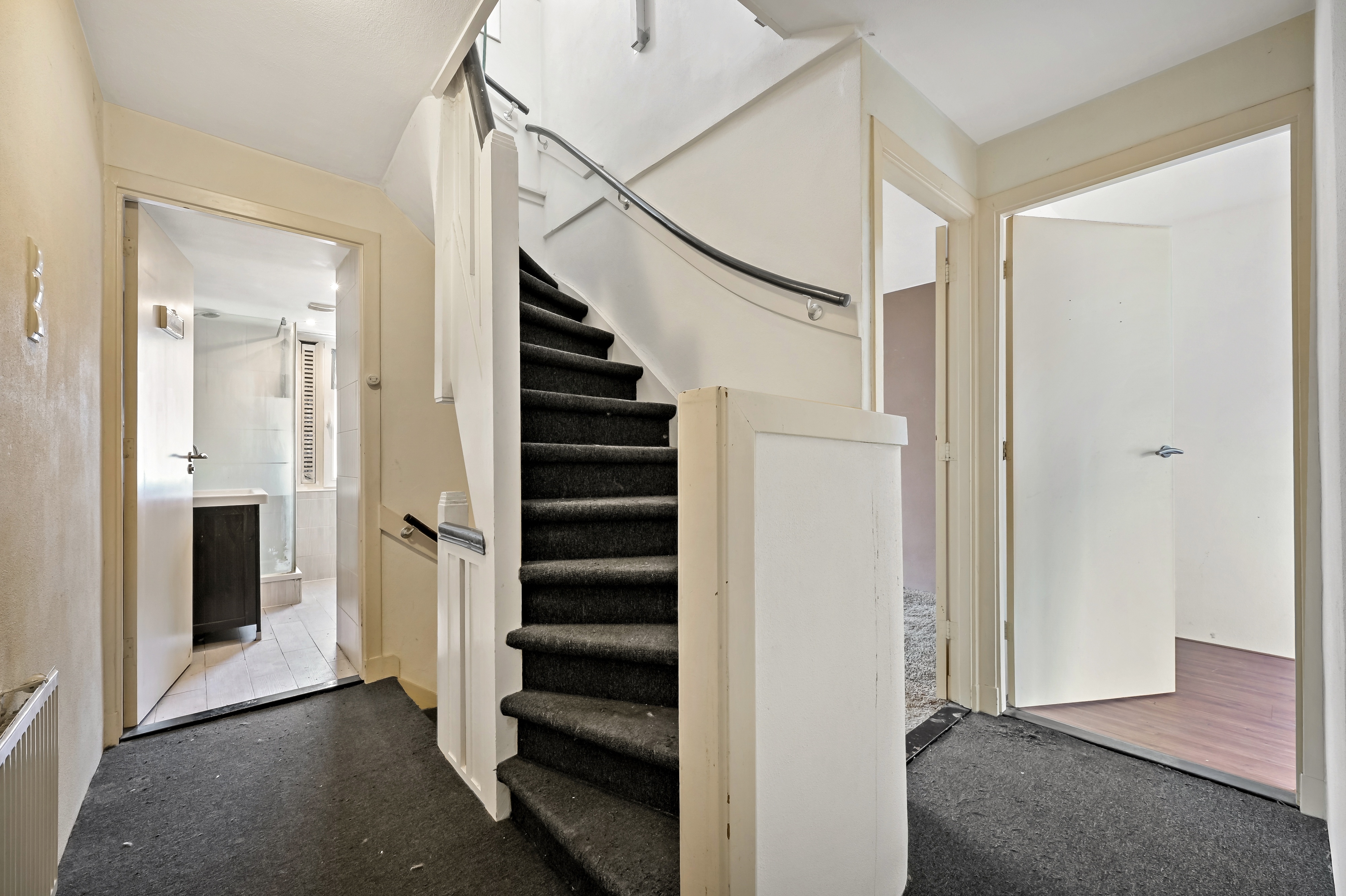 L-vormige overloop met toegang tot alle vertrekken en trap naar de 2e verdieping. Slaapkamer I (4.55 x 3.77) aan de voorzijde met zonnig balkon (2.60 x 0.91). Slaapkamer II (4.80 x 2.59) aan de achterzijde. Badkamer (2.68 x 1.81) aan de achterzijde, welke voorzien is van een douche, een 2e toilet en een wastafel.