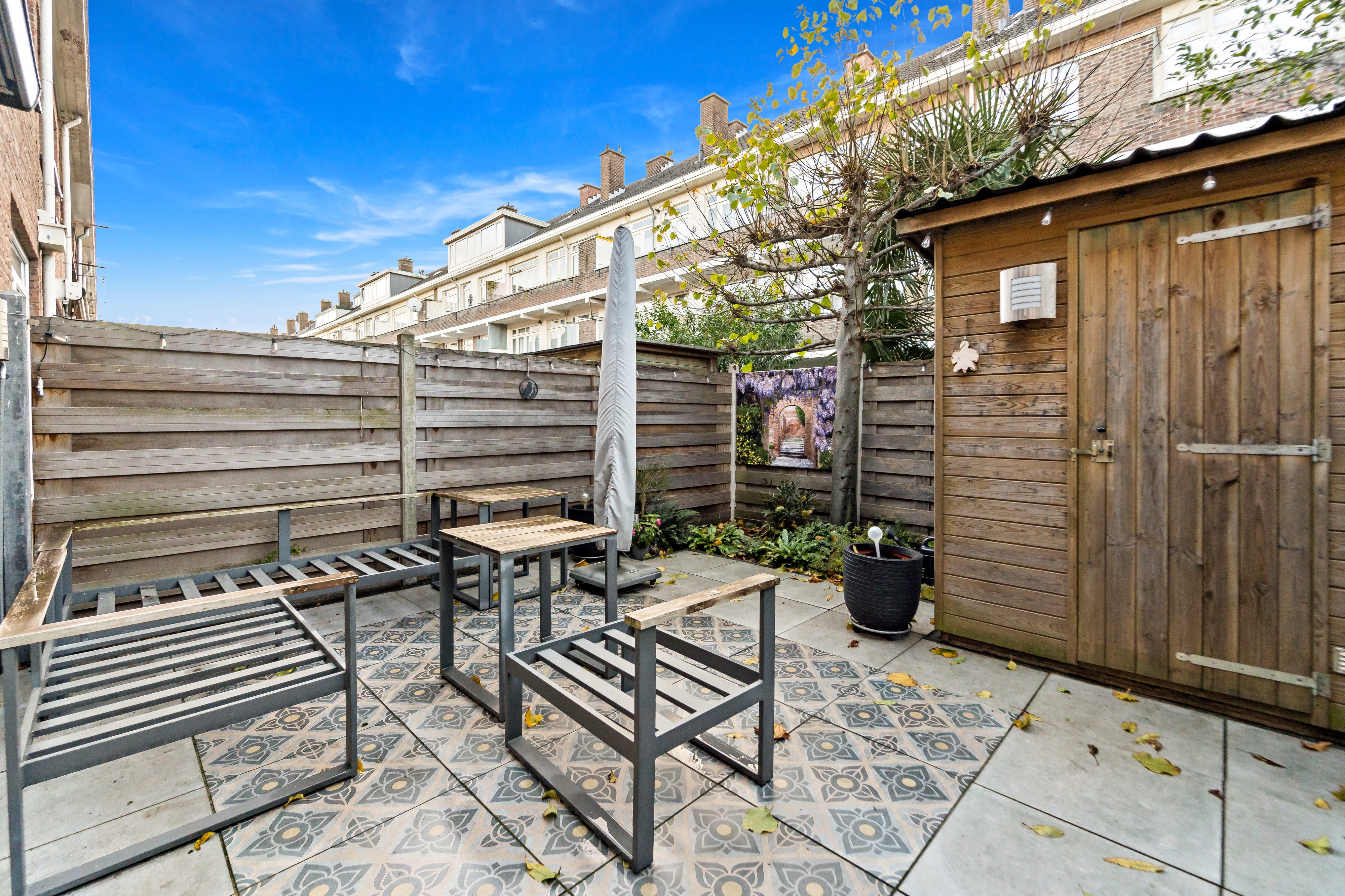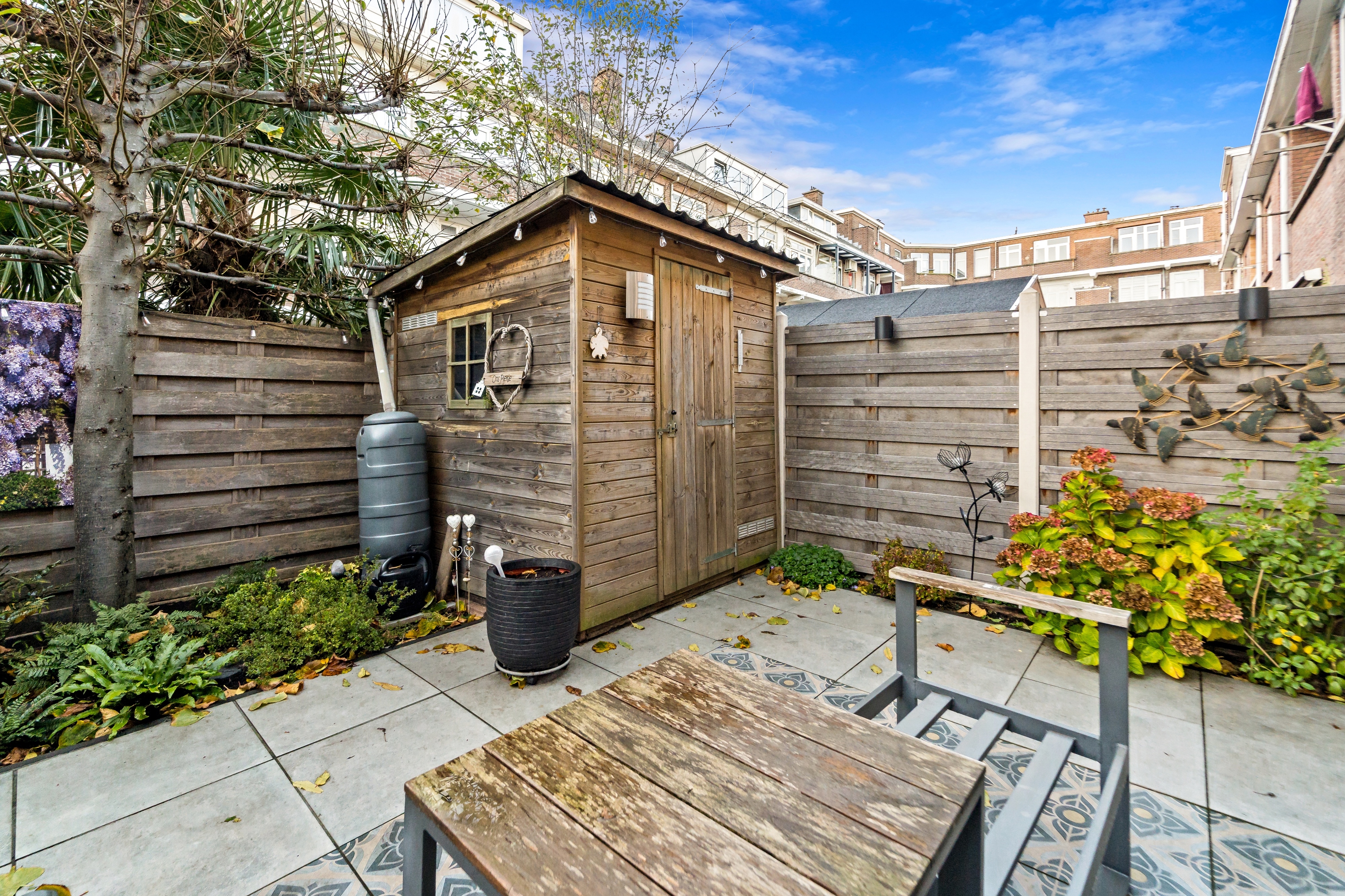 - Zonnige achtertuin (5.75 x 5.50) met berging gelegen op het zuidwesten;